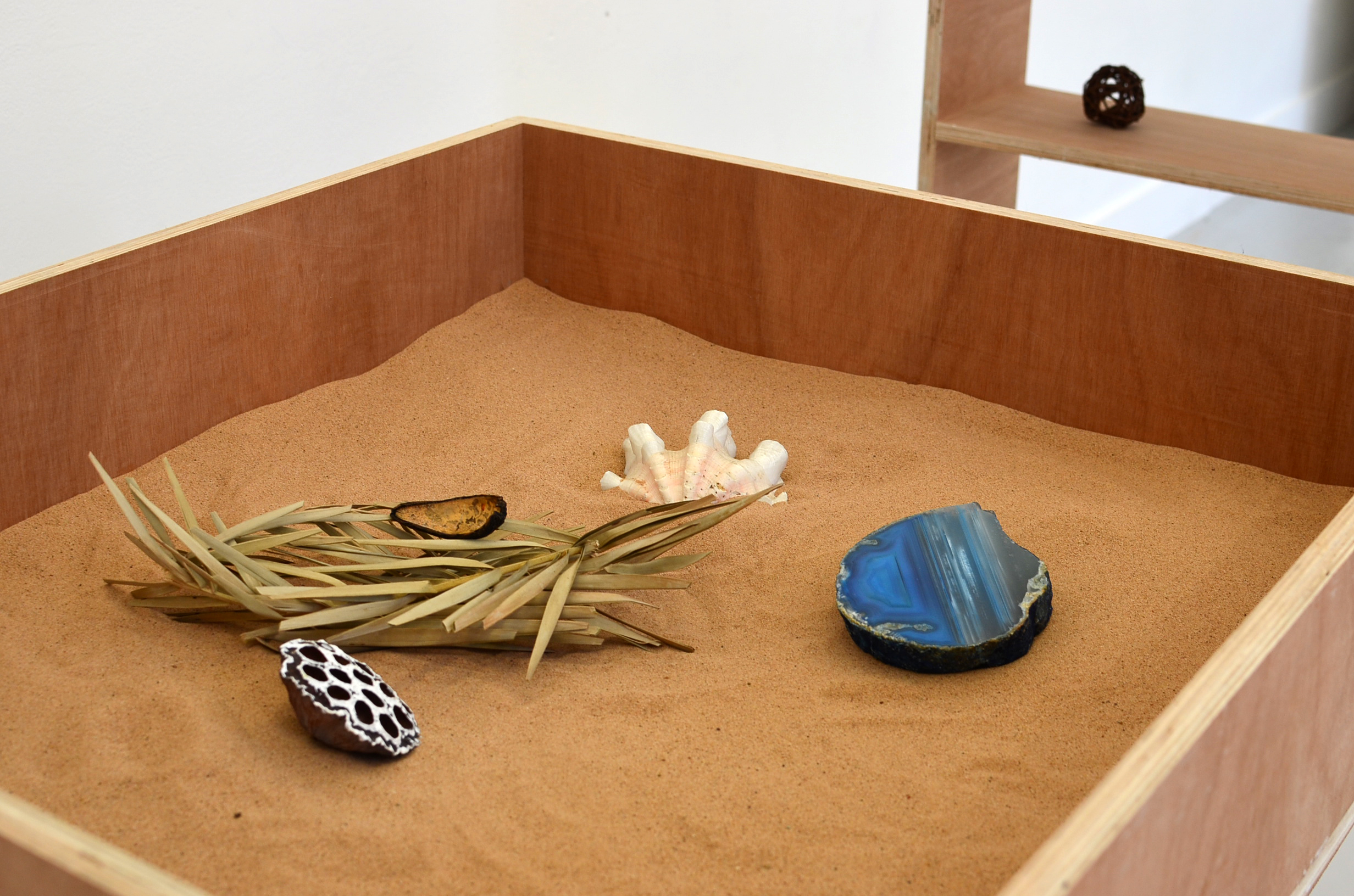 Wooden sandplay-box table, wooden shelf, non-manmade objects